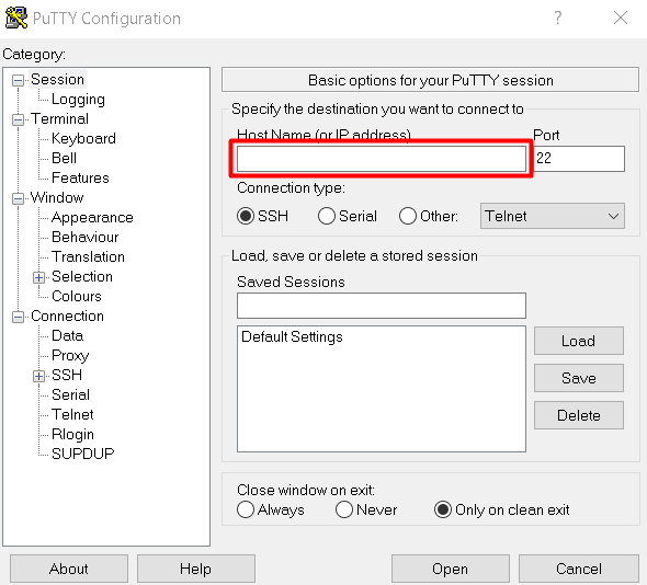 Launch the Putty Terminal client and you will get the following window. Enter your VPS IP address, check the SSH button, and then click Open.