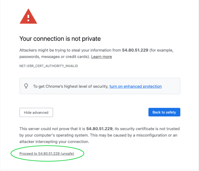 2. Ignore the self-signed certificate warning, click on Advanced, and then Proceed to continue to CloudPanel.