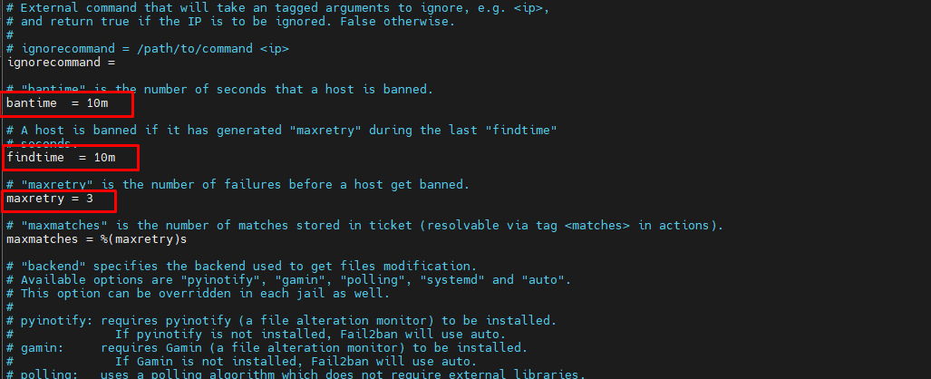 The bantime option is the time of IP address will be banned to access the server. The findtime option is the duration between the number of failures before the ban action. And the maxretry option is the number of failures for IP addresses to get banned.