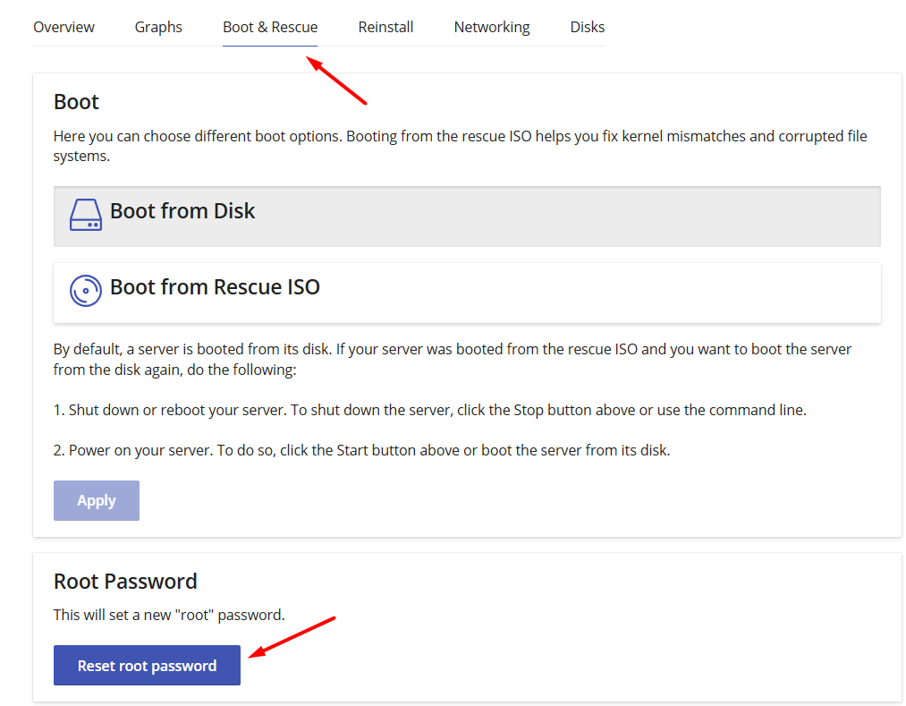- Linux VPS: Resets the root password.