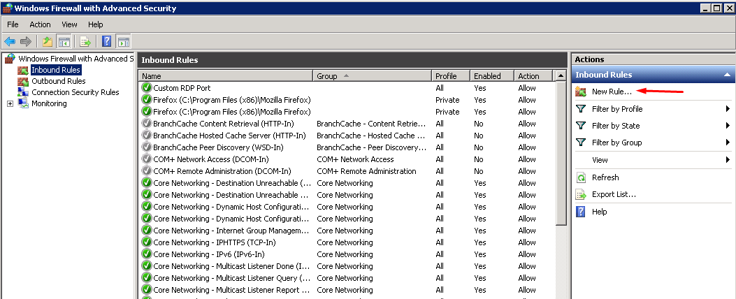 In order to open an inbound port, go to "Inbound Rules" under the "Windows Firewall with Advanced Security on Local Computer", and click "New Rule..." in the sidebar.