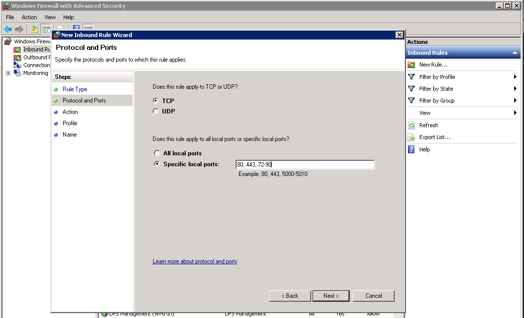 Next, choose "Specific local ports" so that you can manually set which ports need to be opened with the rule. For example: "80". You can also open multiple ports with one rule, with a comma-separated list: "80, 443". We can also set a range of ports to be opened: "72-90". This will open all ports between 72 and 90. We can also combine this: "80, 443, 72-90". This will open the ports 80, 443, and all ports between 72 and 90. Click "Next".