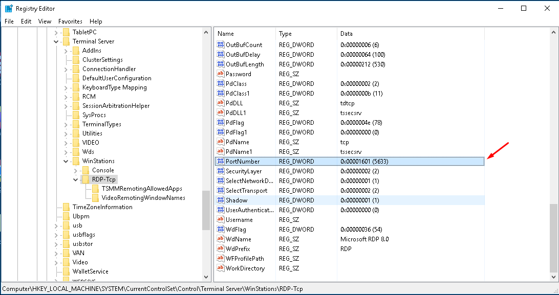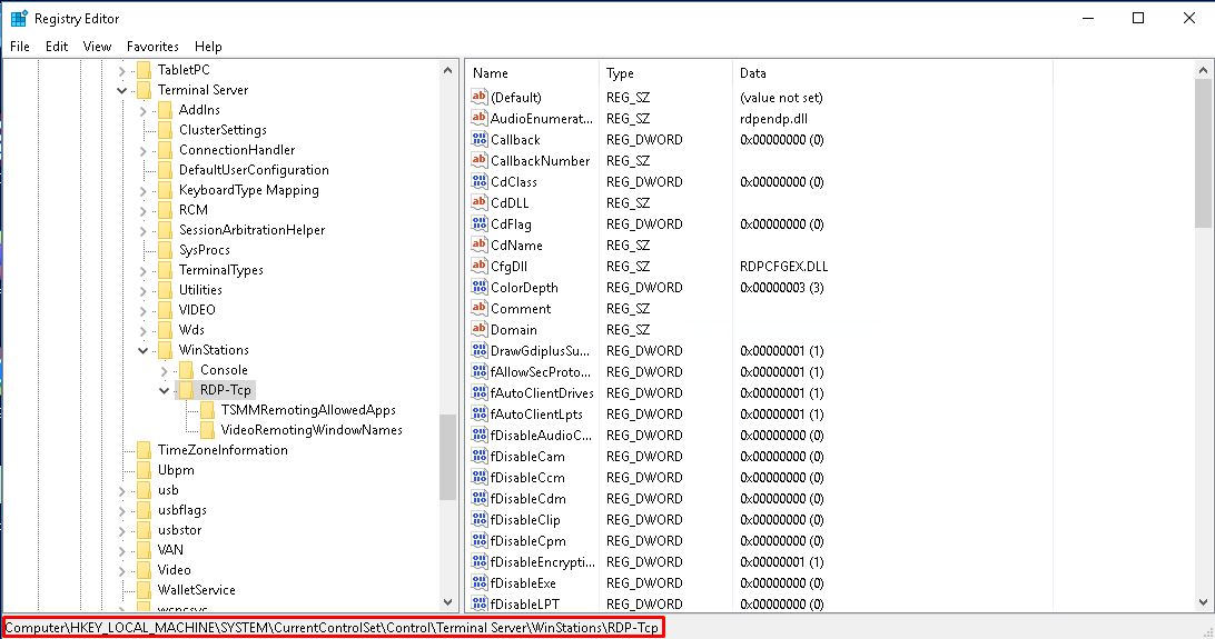 Navigate to the following registry subkey: HKEY_LOCAL_MACHINE\System\CurrentControlSet\Control\Terminal Server\WinStations\RDP-Tcp