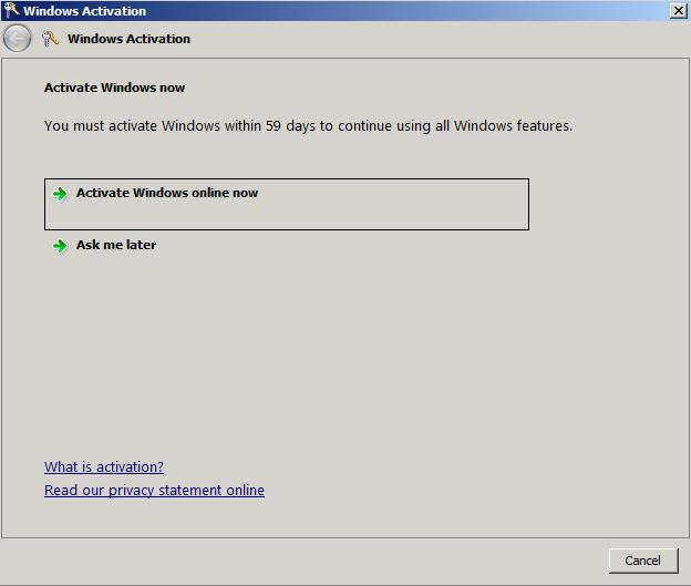 The Windows Activation page will be displayed. Click on Activate Windows online now to start activating your Windows copy, or click on Ask me later to cancel the operation.