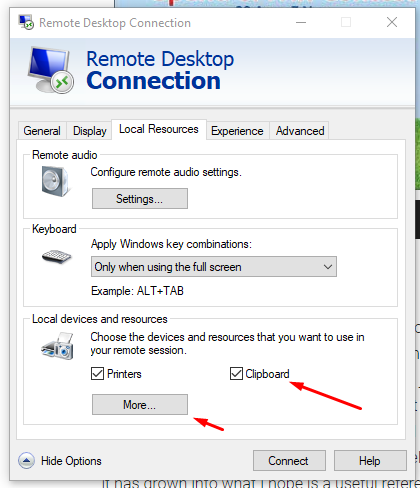 Check the “Clipboard” option. To allow file copying and pasting, select “More…” and proceed to step 4. If you just need the ability to copy and paste text and not files, stop here and click “OK“.