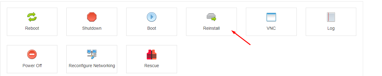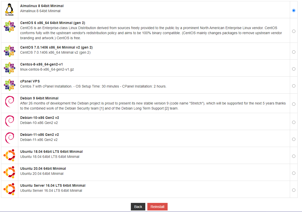 List of available Operating Systems available. Choose your desired operating system, click Reinstall and confirm the installation.