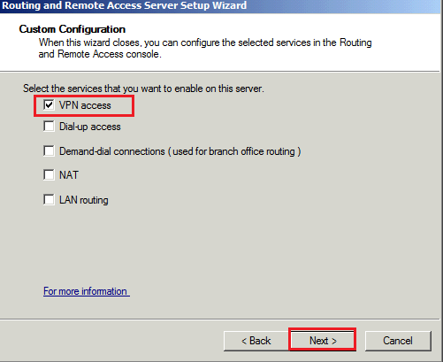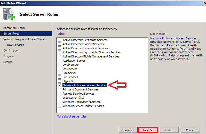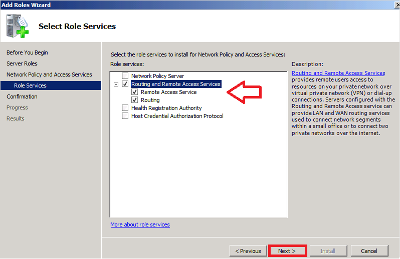 5. Select the Role Services Routing and Remote Access Services and then Click Next.