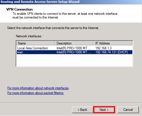 11. On the Network Selection page, select the network you want users to connect to after they dial in, then Click Next.