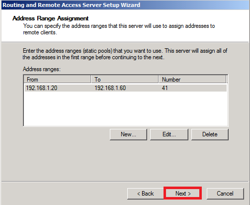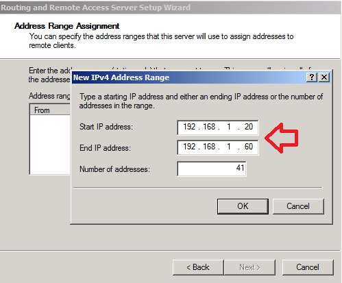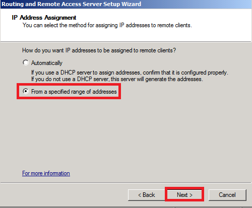 12. Select Automatically if there is already a DHCP server on the network or otherwise choose A Specified Range Of Addresses and then Click Next.