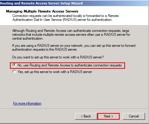 15. Select No, Use Routing And Remote Access To Authenticate Connection Requests. Then, Click Next.