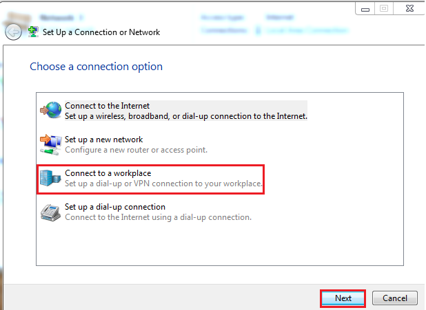 18. Go to Network and Sharing center and choose set up a connection or network then Select Connect to a Workplace option.